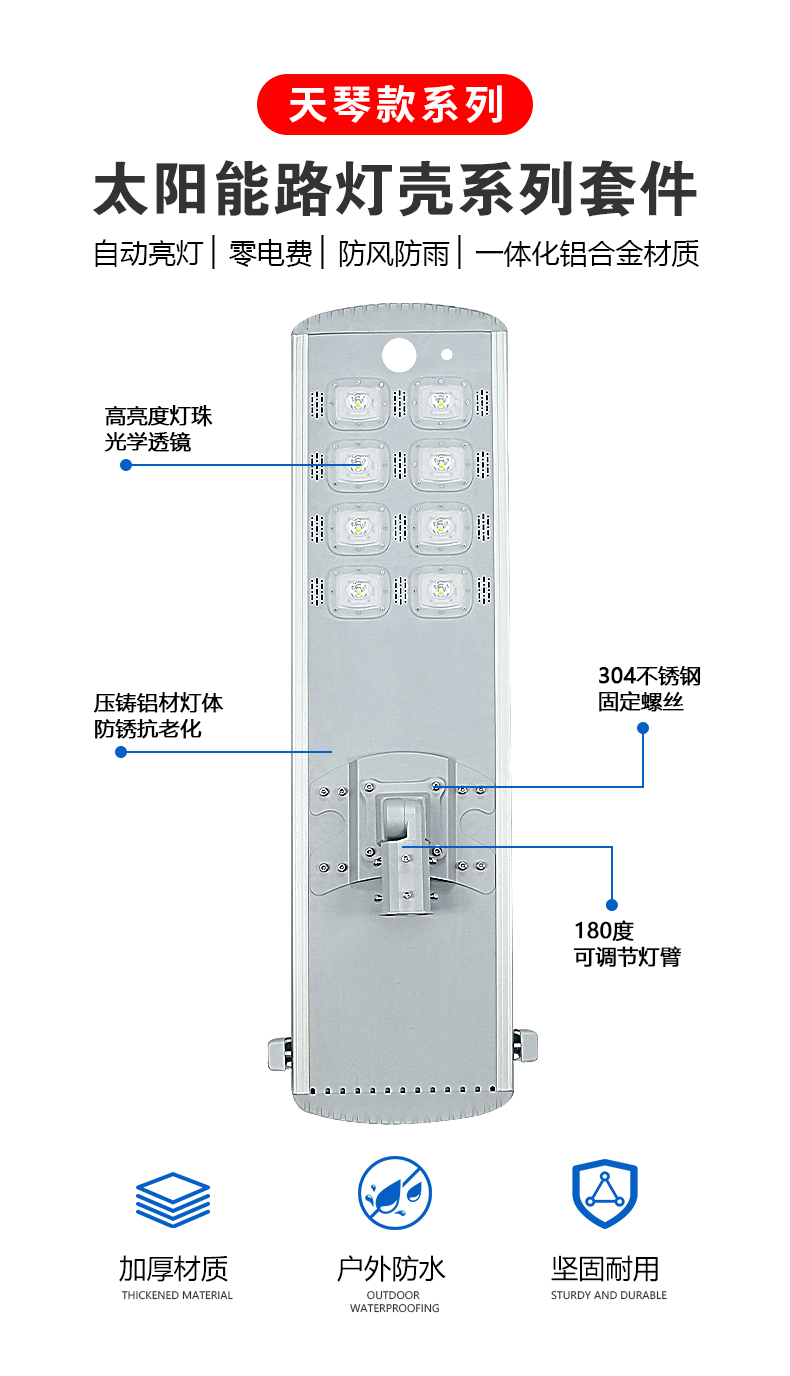 产品特点: 1.一体化专利外观设计,简约时尚,光伏板自动清扫。 2.此款材质为铝合金,万向节套筒底座可调节角度。 3.可根据客户需求定制尺寸,颜色及logo 产品参数: 外壳尺寸: 1233*373*50mm 适用光伏板尺寸: 1125*348mm 适用光伏板瓦数:60W 材质: 铁+铝合金 表面处理: 喷粉烤漆 包装: 散件纸箱加缓冲泡棉
